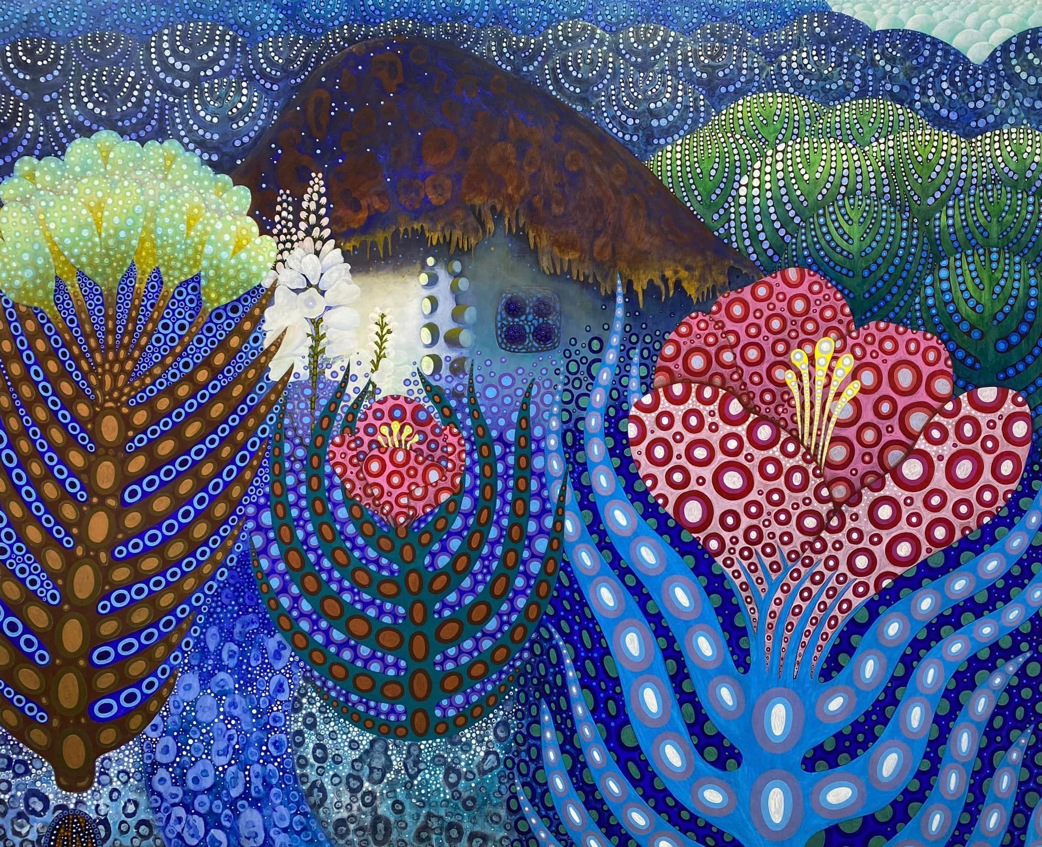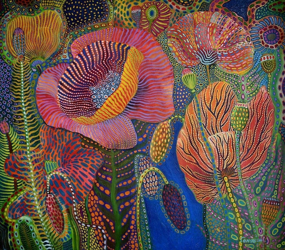 This Ukrainian painter creates what she calls "magical realism" — psychedelic forest dreamscapes that vibrate with rhythmic patterns. Her canvases look almost embroidered, influenced by her passion for beadwork and textile art. Born in Cherkasy, she's also a professional singer and poet who creates works people describe as having a therapeutic, harmonizing effect on the viewer.