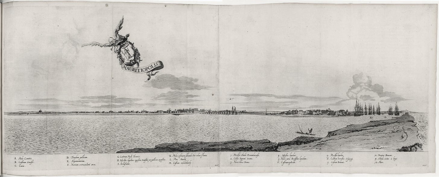 Brazil. A colony wrested from the Portuguese six years earlier by the West India Company. The richest sugar region in the New World. The Company is now sending a new governor to administer it. Johan Maurits of Nassau-Siegen. 32 years old. Great-nephew of William the Silent, hero of Dutch independence. An ambitious man who wants to transform the colony. He’s brought an entire team. A naturalist to catalogue the fauna and flora. A physician to study medicinal plants. Two painters. Scientists. Nassau wants to make Brazil more than a trading post.
