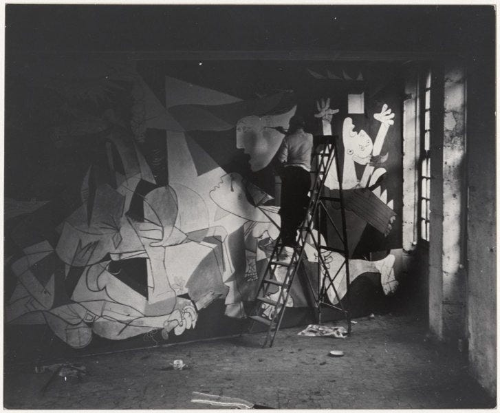 The two women end up grabbing each other. They fight on the floor, in front of the unfinished canvas, while Picasso paints a fallen horse screaming.