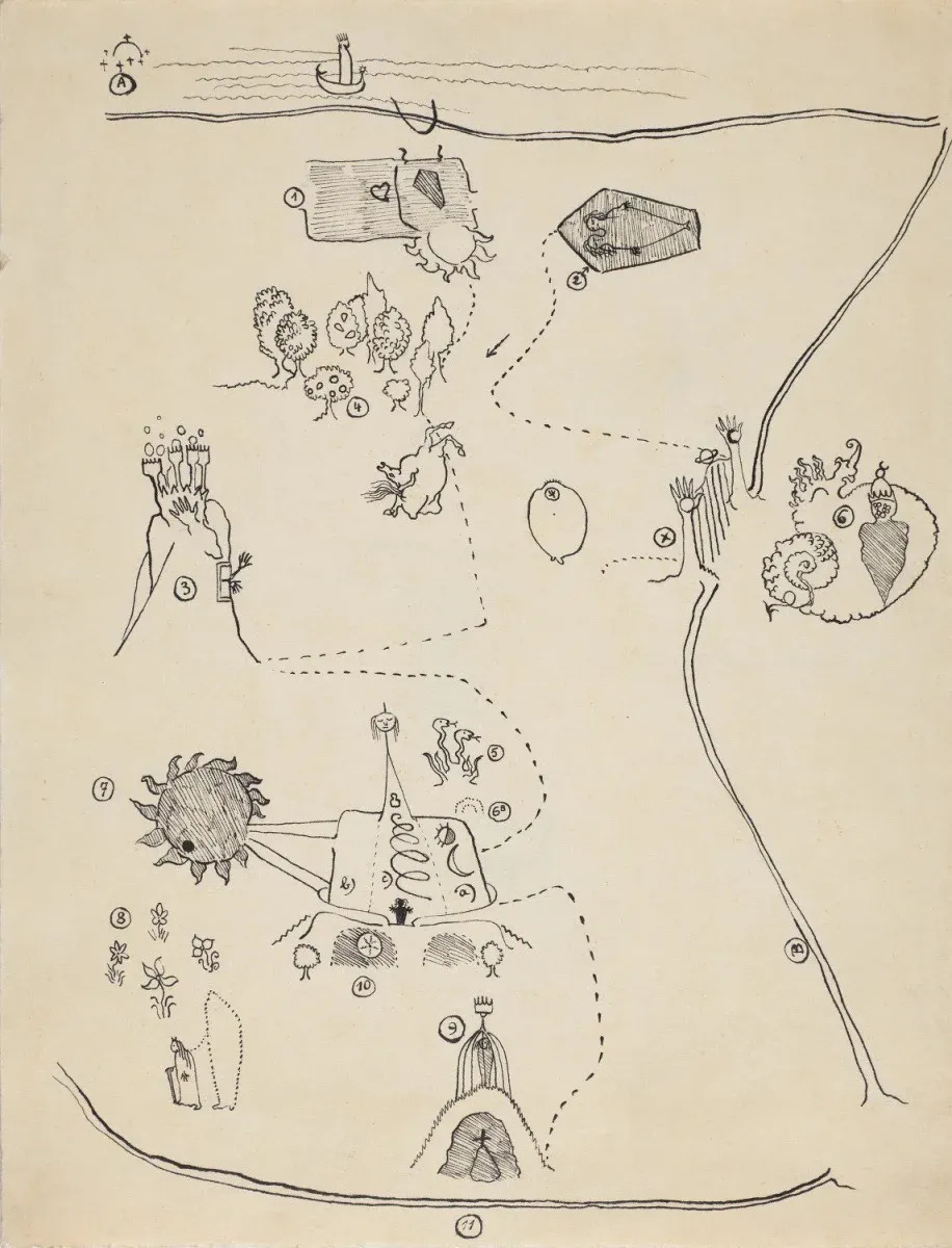 To survive, she mobilises her surrealist mind. Traces fantastic maps on the walls populated with esoteric symbols. Arranges breadcrumbs in geometric patterns. Each drawing forms a mental escape plan. When she shows her works to Morales, he orders a new injection. Sometimes she hangs from the bars, head down, like a bat.