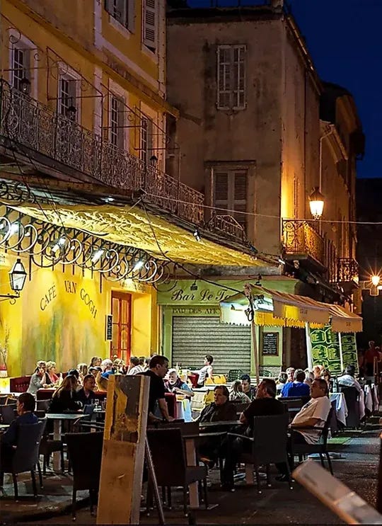 In September 1888, Van Gogh painted the gas-lit terrace at Place du Forum in Arles, southern France. The café, now at 11 Place du Forum (renovated in the 1990s to match the painting's yellow facade), closed in 2023 but the building still stands. You can visit Arles, about 130 km north of Marseille, to see where Van Gogh created this starry night scene.