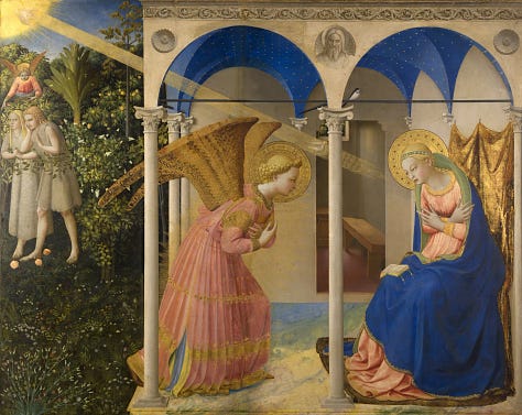 ⚪ White lily Always present in Annunciation scenes, held by the angel or placed in a vase nearby. Closed bud = virginity. Open flower = the moment of conception. Sometimes painters showed both on the same stem.