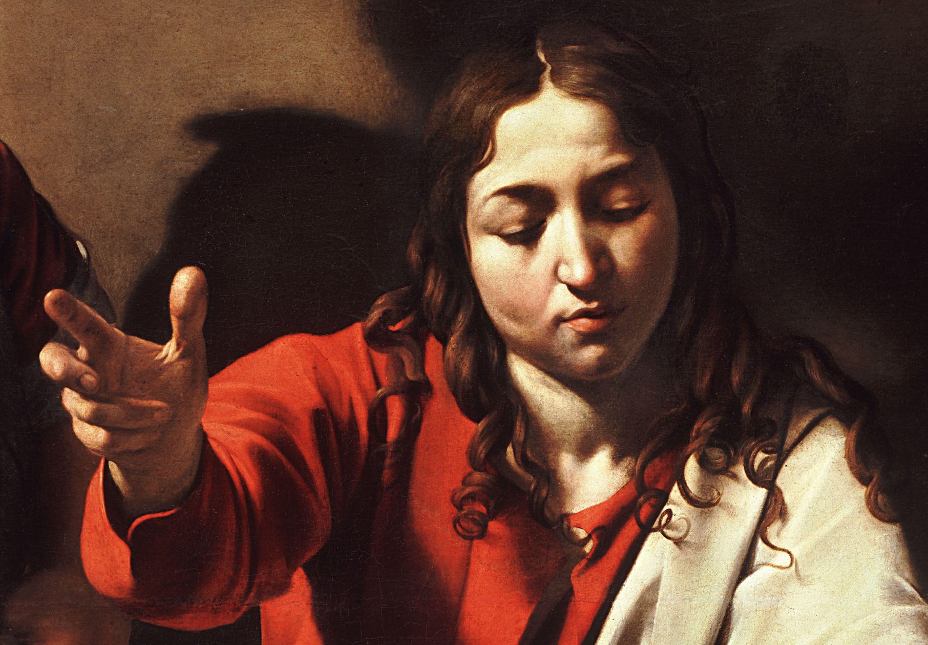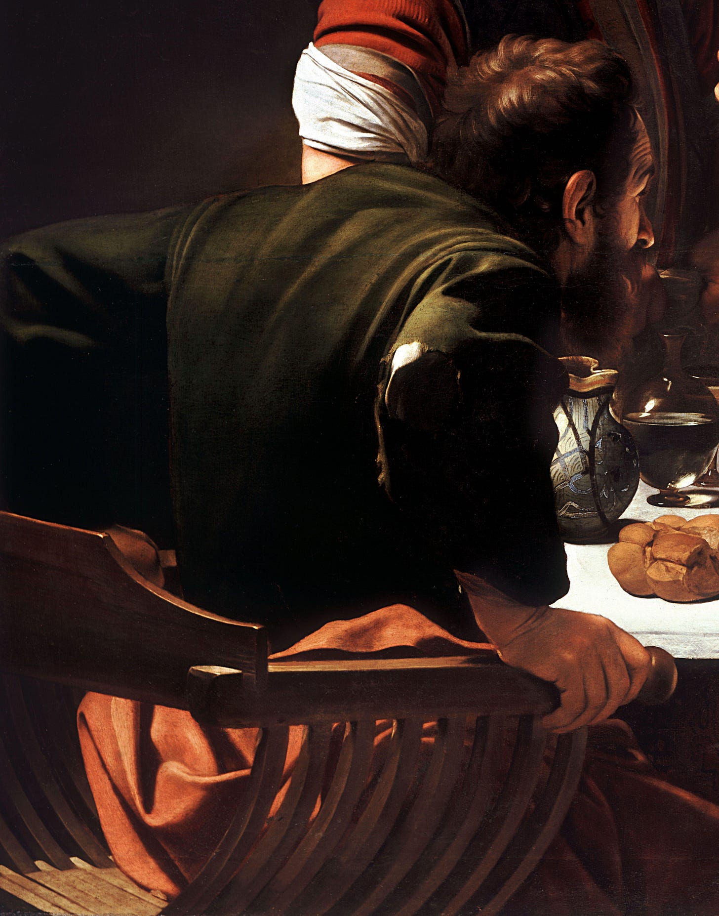 At the centre of the painting, Jesus blesses the bread. He is 33 years old but his face is strangely young, beardless, almost feminine. This is no error: in the biblical texts, it is written that Jesus reappeared “in another form” after his death. Caravaggio takes the text at face value and paints an unrecognisable Christ.