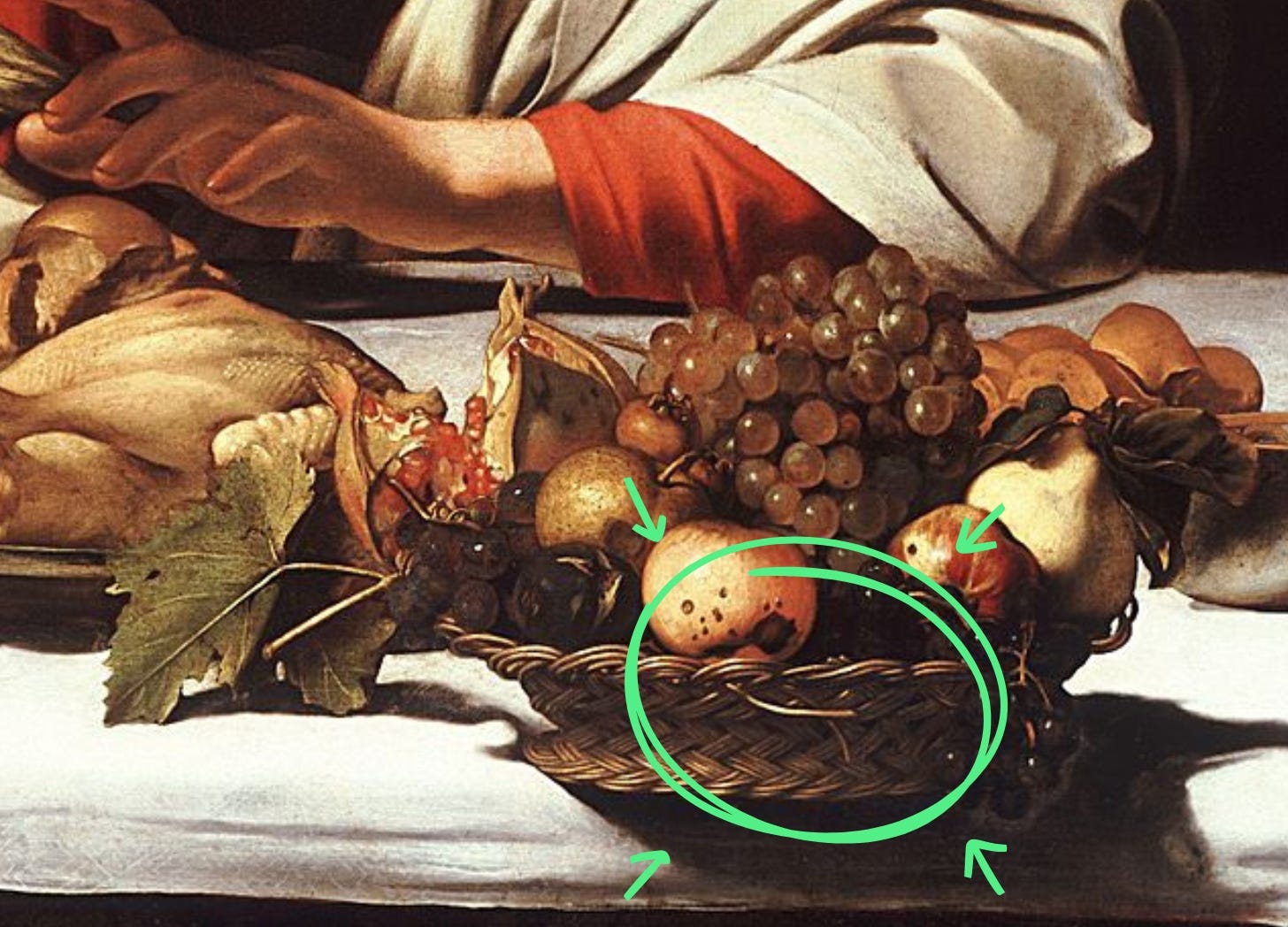 The basket overflows, placed in balance at the edge of the table. It appears about to fall towards us. For centuries, specialists have admired this still life. The hanging leaves, the fruit painted with impressive realism, the wickerwork woven meticulously. Too perfect, perhaps.