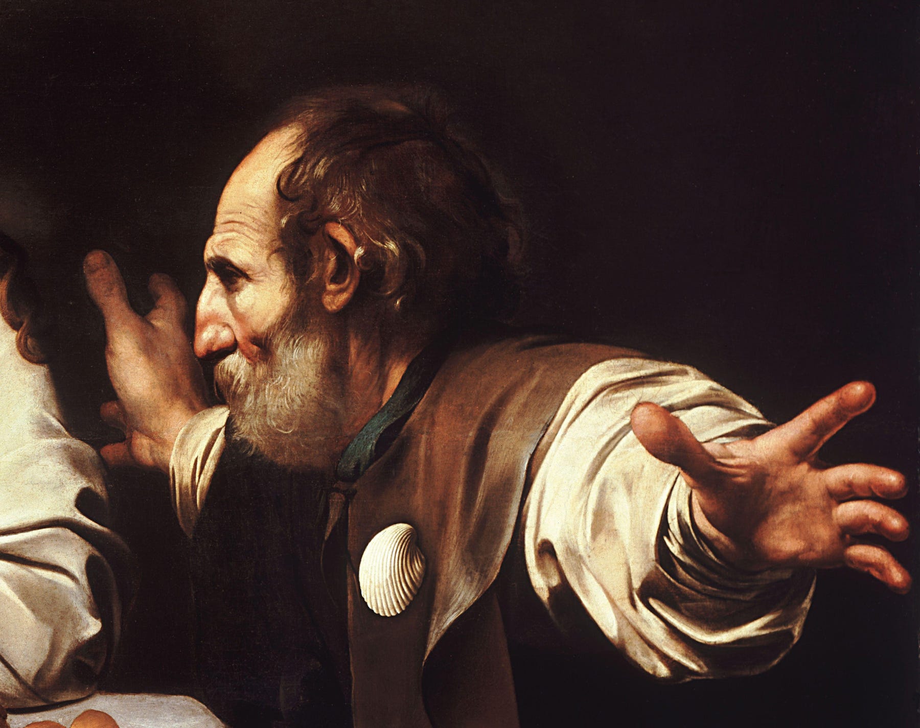 To the right of Jesus, Cleophas straightens abruptly, hands clenched on the armrests of his chair. On his cloak, a shell: the symbol of pilgrims who walk towards holy places, the emblem of those who seek God.