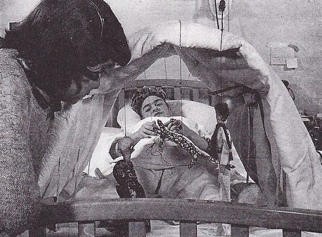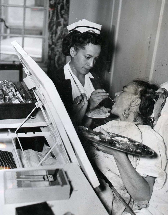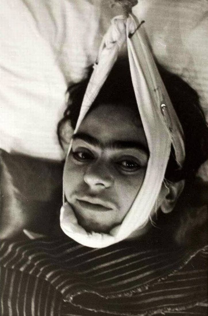 She remained bedridden for a year in a plaster cast. Her father installed a mirror above her bed and brought her paintbrushes. It was there, immobilized, that she truly began to paint. Her first self-portrait dates from 1926. She would undergo 32 operations throughout her life attempting to repair her broken body.