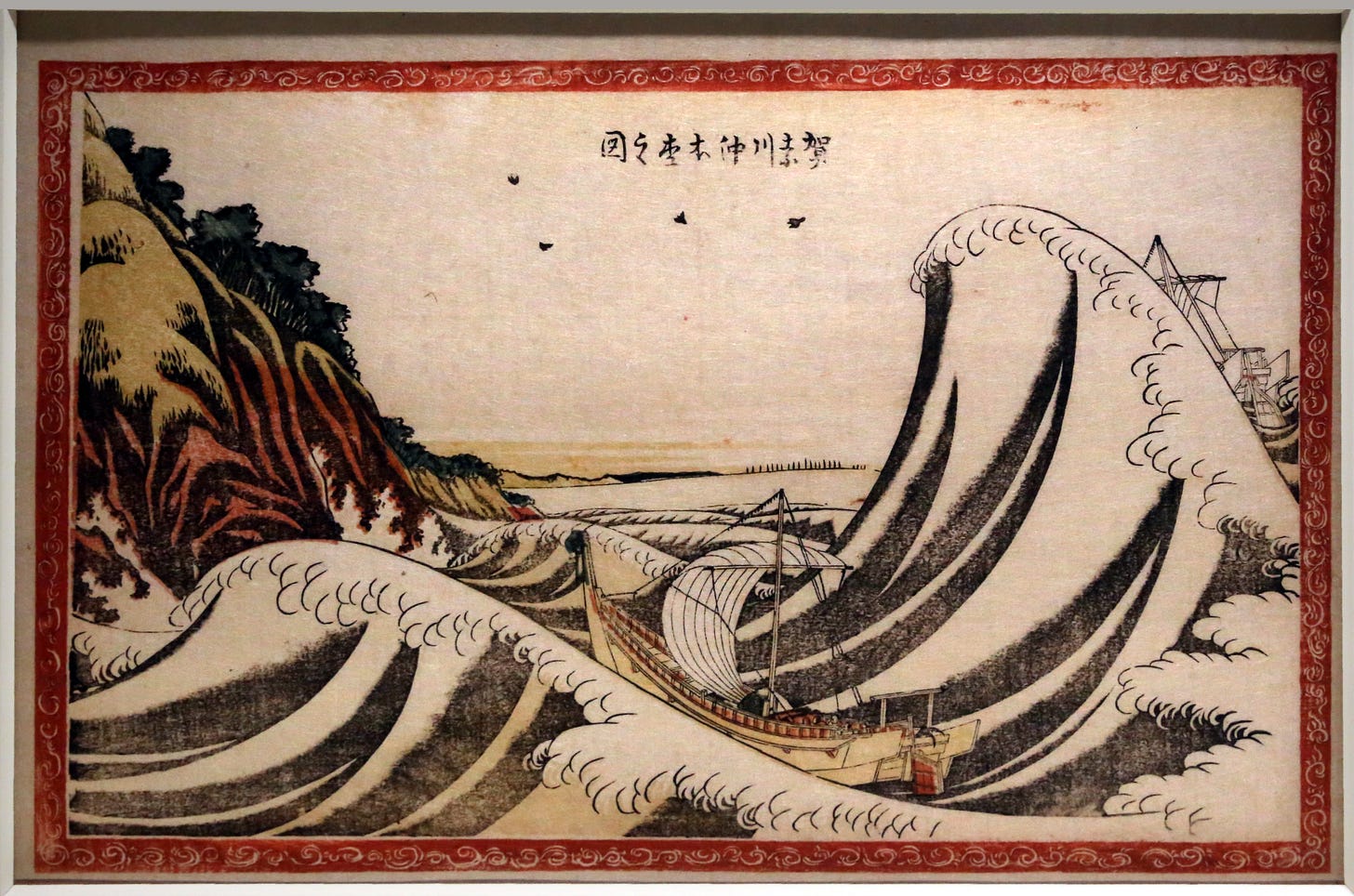 Six years have passed. Hokusai has changed his name twice, moved at least ten times. At 44, he engraves View of Honmoku off Kanagawa in a new studio in the printmakers’ district. This time he removes almost everything: the strollers, Mount Fuji. The wave invades the image, occupies two thirds of the space. A vessel cuts through the water nearby, shrunk to heighten the contrast.