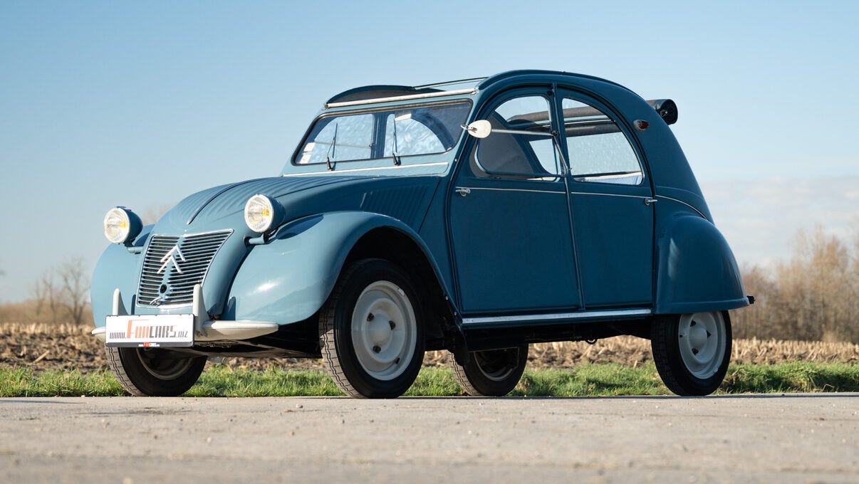 1952 Citroën 2CV: Literally designed so French farmers could transport eggs across plowed fields without breaking them, pure function, zero pretension.