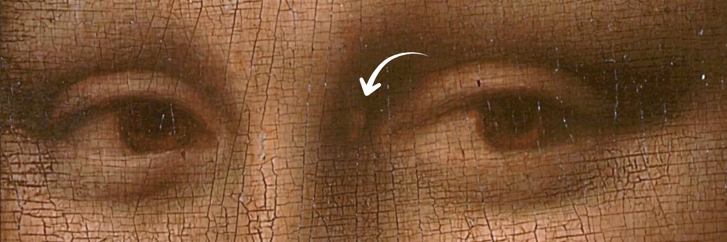 In 1550, Giorgio Vasari describes the painting. He affirms that Leonardo had painted thick eyebrows, “here dense, there sparse,” with such precision that one could distinguish the pores of the skin. In 2007, engineer Pascal Cotte does indeed detect the trace of a brushstroke depicting a hair above the left eye. Proof that the eyebrows existed. But they were evidently very discreet. Today, nothing can be seen.